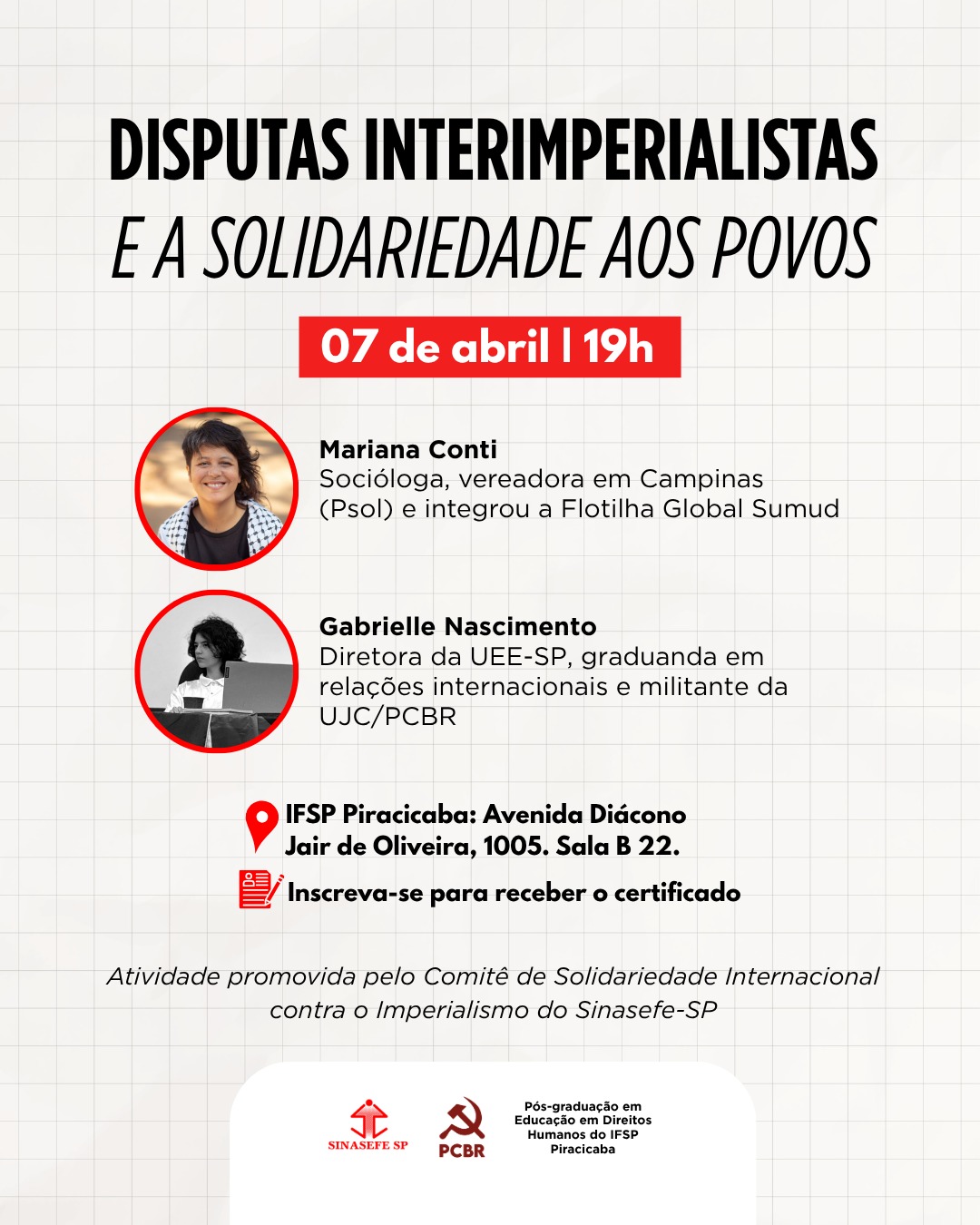 ✊🏽 O Sinasefe-SP convida para a atividade “Disputas interimperialistas e a solidariedade aos povos”, que acontece no dia 7 de abril, às 19h, no IFSP Campus Piracicaba.
