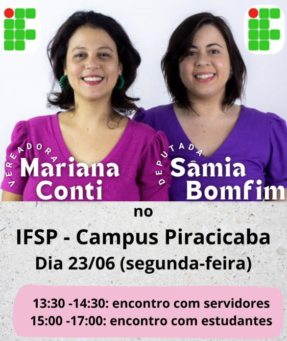 A Deputada Federal Sâmia Bomfim e a vereadora Mariana Conti (de Campinas) estarão, no próximo dia 23/06, no IFSP, campus Piracicaba, para dialogarem, com servidores e estudantes, sobre os desafios da educação no Estado de São Paulo e o papel estratégico do IFSP, campus Piracicaba para o desenvolvimento da macro região de Piracicaba.