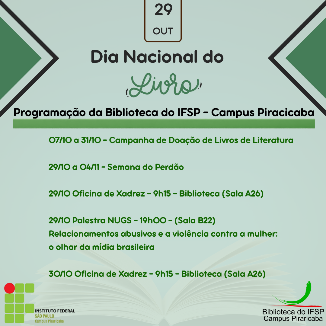 Em comemoração ao Dia Nacional do Livro, celebrado em 29 de outubro, o IFSP campus Piracicaba promoveu uma programação especial, com o apoio dos servidores Aline Espassa Caldeira,...